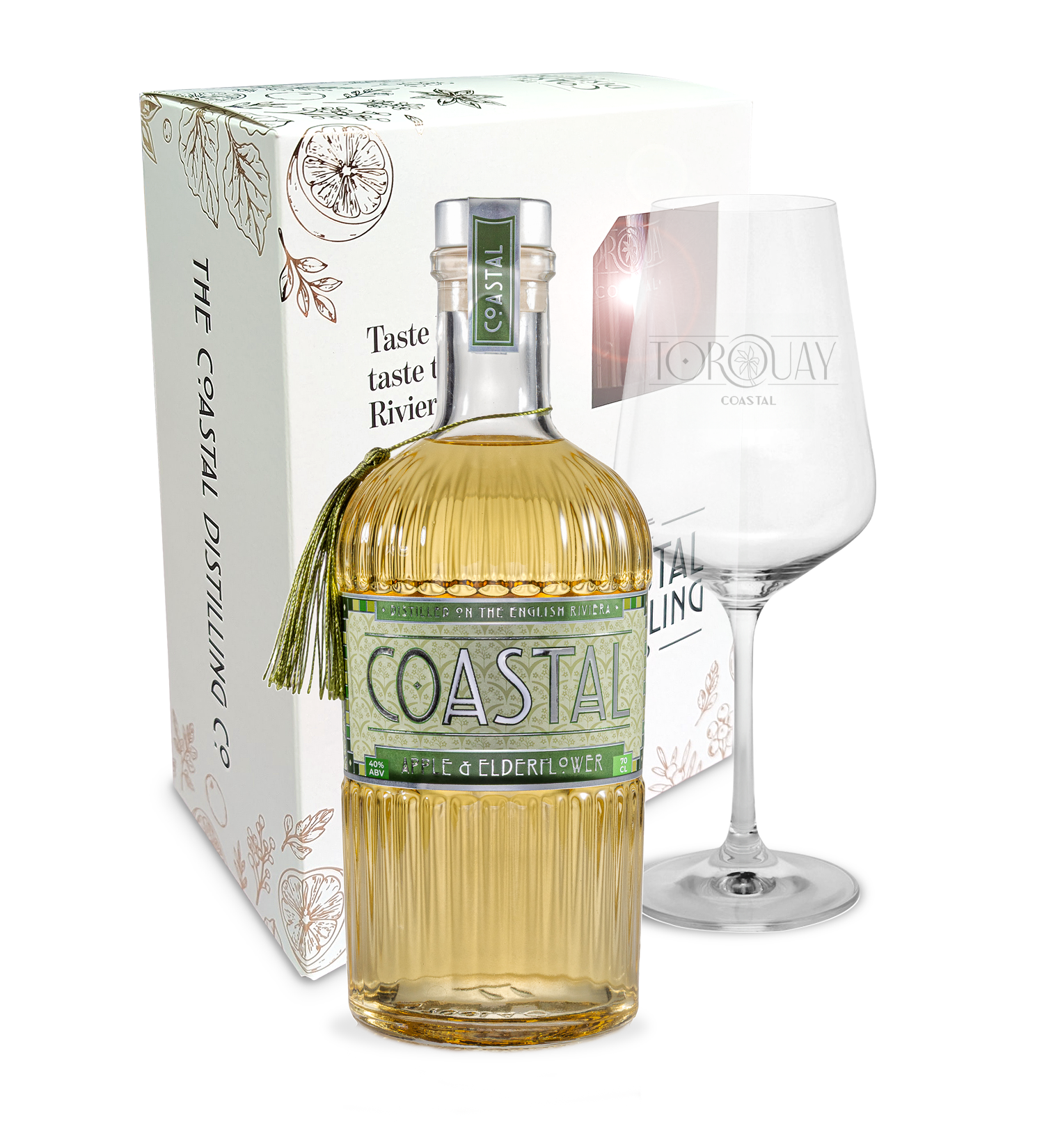 The Coastal Apple & Elderflower Gin Gift Set pairs a bottle of our handcrafted gin with a bespoke Dartington Crystal branded glass, presented in a premium gift box.